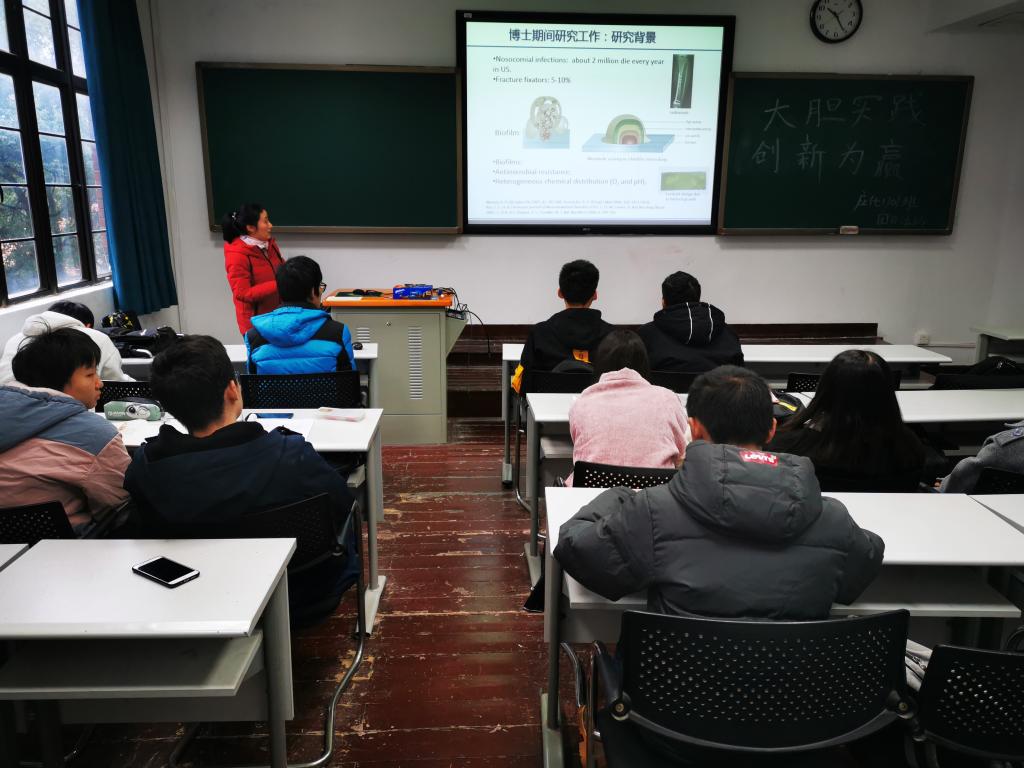 紧接着,汪凤林老师向大家介绍了她的学习、科研经历,以及本专业当前的科研热点。汪老师鼓励大家道:“科研要坚持、沉淀,勇于面对失败,以一颗平常心去对待得失。”同时,老师也欢迎大家前去老师的课题组学习、研究。汪老师的介绍让大家有了很大触动,很多同学开始思考自己以后的科研方向以及人生方向。一些计划出国深造的同学还向老师请教了本专业在出国方面的要求及优势。老师也一一作了讲解,同时希望同学们在国外学有所成之后,回到故土,报效祖国。