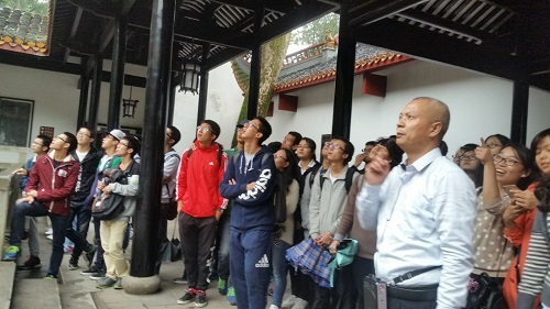 紧接着龙兵老师向同学们介绍了中国共产党的优秀领导人——毛泽东主席。龙兵老师着重介绍毛主席所拥有的崇高品德,并播放有关毛主席的珍贵历史影像,向同学们展现了一个有血有肉的毛泽东,同时也在同学们的心中建立起一个和蔼可亲,艰苦朴素的领导人形象。简洁的介绍过后,龙兵老师带领同学们前往抗战后遗留下来的图书馆遗址,岳麓书院和爱晚亭等地,为达“亲临其境才能获取更深的领悟”的目的。图书馆门前,岳麓书院中,爱晚亭下都有龙兵老师绘声绘色的讲解,同学们围在他的周围聆听着这诉说着动荡年代的低沉声音。