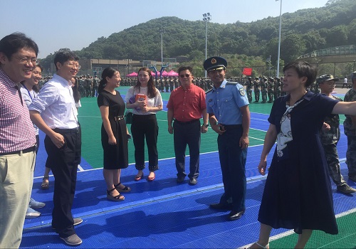 党委书记王玉枝教授,院长蒋健晖教授,院党委副书记陈义红老师,副院长尹双凤教授,副院长崔坤在老师,化学工程与工艺1701班班导师金波老师,化工1702班班导师黄杨强老师,学工办刘卓老师、何妮翰老师以及17级辅导员曾芷兰老师一齐来到训练场地,亲切看望军训教官和2017级军训新生.