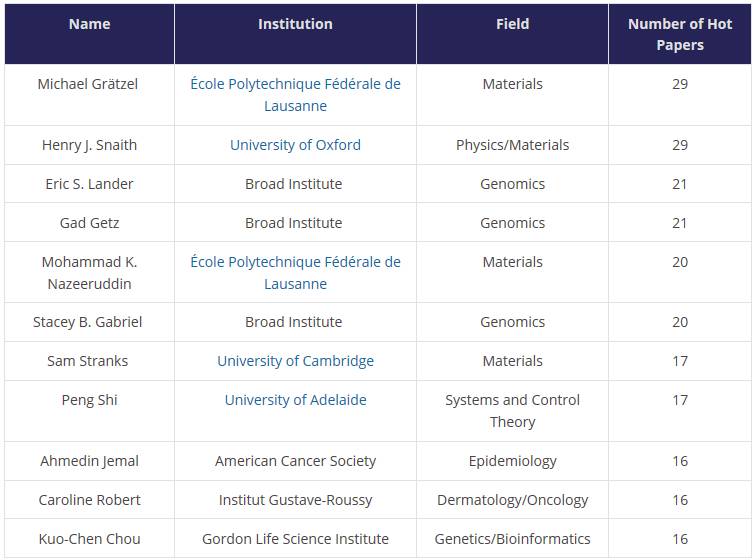 热门论文数量最多的十位科学家: