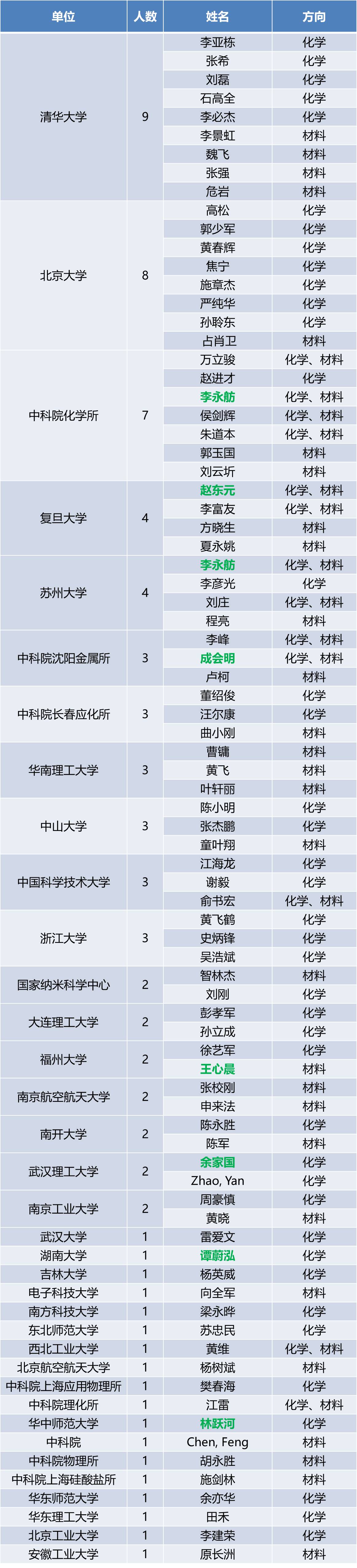 纳米人编辑部从整个名单中整理了材料、化学领域入选的华人科学家名单,具体如下(排名不分先后):