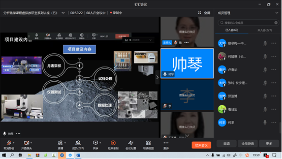 地球观测与信息提取的新理论、技术和方法也属于“十四五”NSFC地球科学部优先发展领域。因此,分析化学课程在地质行业人才培养中的重要地位日益凸显。帅琴教授对本校分析化学课程团队如何结合地质大学人才培养特色及行业需求,紧扣服务国家资源战略和国民经济主战场主题,以提高教学质量建设一流课程为宗旨,进行《分析化学》课程群系列课程建设做了详细介绍。提出根据不同专业需求设计分层教学,结合行业需求补充课程内容,拓展课堂外资源延伸课程边界,创新教学手段推进数字化进程,开展基于探月工程的月壤组成和性质分析虚拟仿真实验研究等课程建设的创新思路和有效举措。介绍了如何结合案例分析,采用翻转课堂、对分课堂等课堂讨论方式,激发学生的潜能,提高综合能力。来自分析化学课程虚拟教研室和化学类专业基础理论课程虚拟教研室的六十余位教师参与了本次教研活动。教研交流最后,国家教学名师、博彩平台