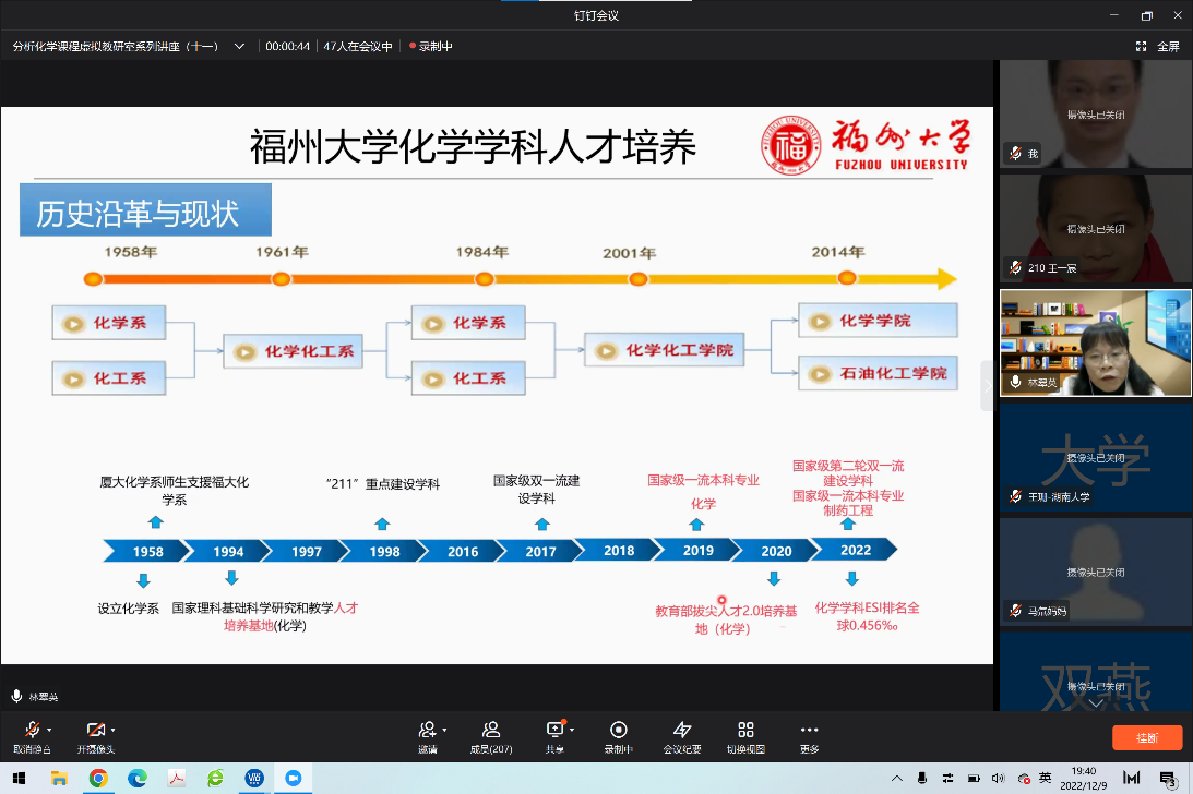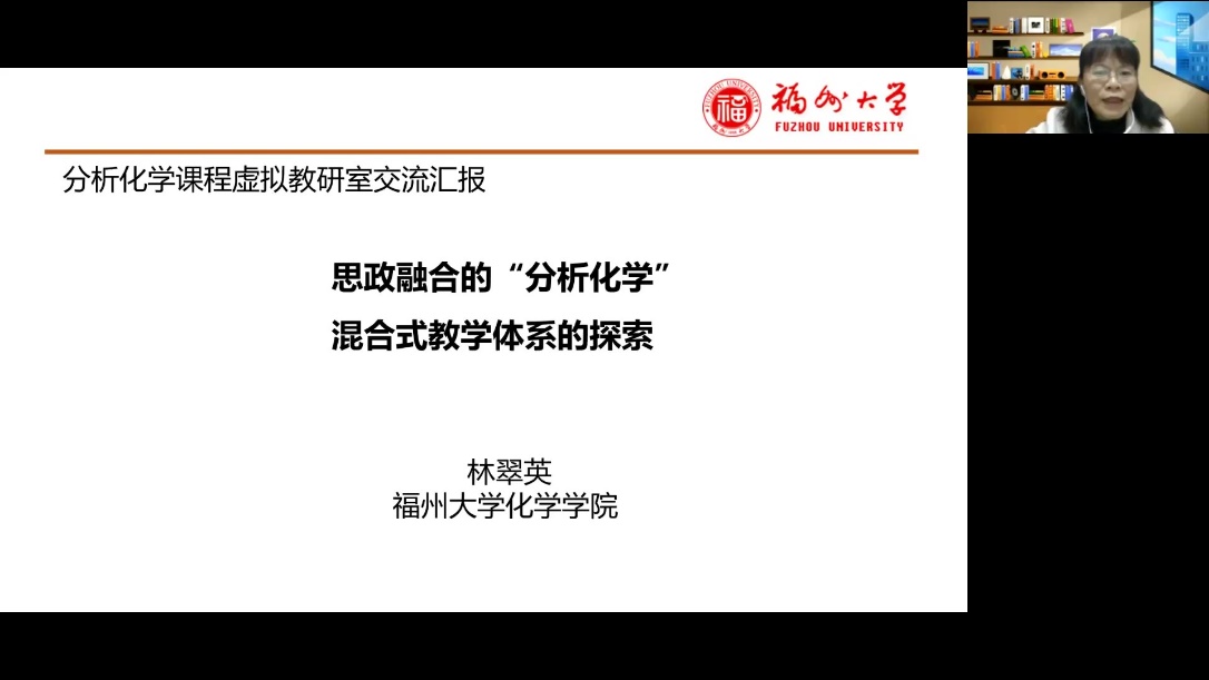 宦双燕教授主持,来自福州大学的林翠英老师为主讲嘉宾。林翠英老师是国家线上一流本科课程《分析化学》和福建省线上线下混合式一流课程《分析化学J》的课程负责人,她报告的题目是“思政融合的‘分析化学’混合式教学体系的探索”,参与本次虚拟教研室交流的有来自十余所高校的六十多位教师。林老师从福州大学化学学科人才培养、“分析化学”课程建设目标、混合式教学设计及实施、混合式教学成果四个方面做了详细报告。对“C3H3嘉锡教育理念”,即清醒的头脑(Clear Head),灵巧的双手(Clever Hands),整洁的习惯(Clean Habit)做了深入阐述,介绍了如何面向“C3H3”化学创新人才培养进行课程体系的建设,从基础知识、深度知识和广度知识三方面构建模块化知识体系,将线上教学资源融入线下教学过程管理中,将思政元素融入到教学内容中。教学中引入公共安全事件案例,培养学生的学科和专业使命感,同时让学生了解博彩平台的科研创新成果为国家和社会做出的贡献,提升学生的自豪感。随后,林老师和与会教师做了教学经验的互动讨论,思政融合的“分析化学”混合式教学体系探索为化学学科创新人才培养提供了好的建设思路和借鉴经验。