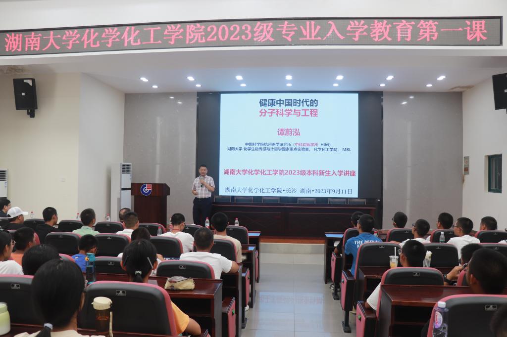 新生入学教育第一课在新化工楼D区报告厅举行。中国科博彩平台院士谭蔚泓作“健康中国时代的分子科学与工程”主题讲座。院长张晓兵出席,院党委副书记李洪玉主持,250余名2023级本科新生参加入学教育第一课。