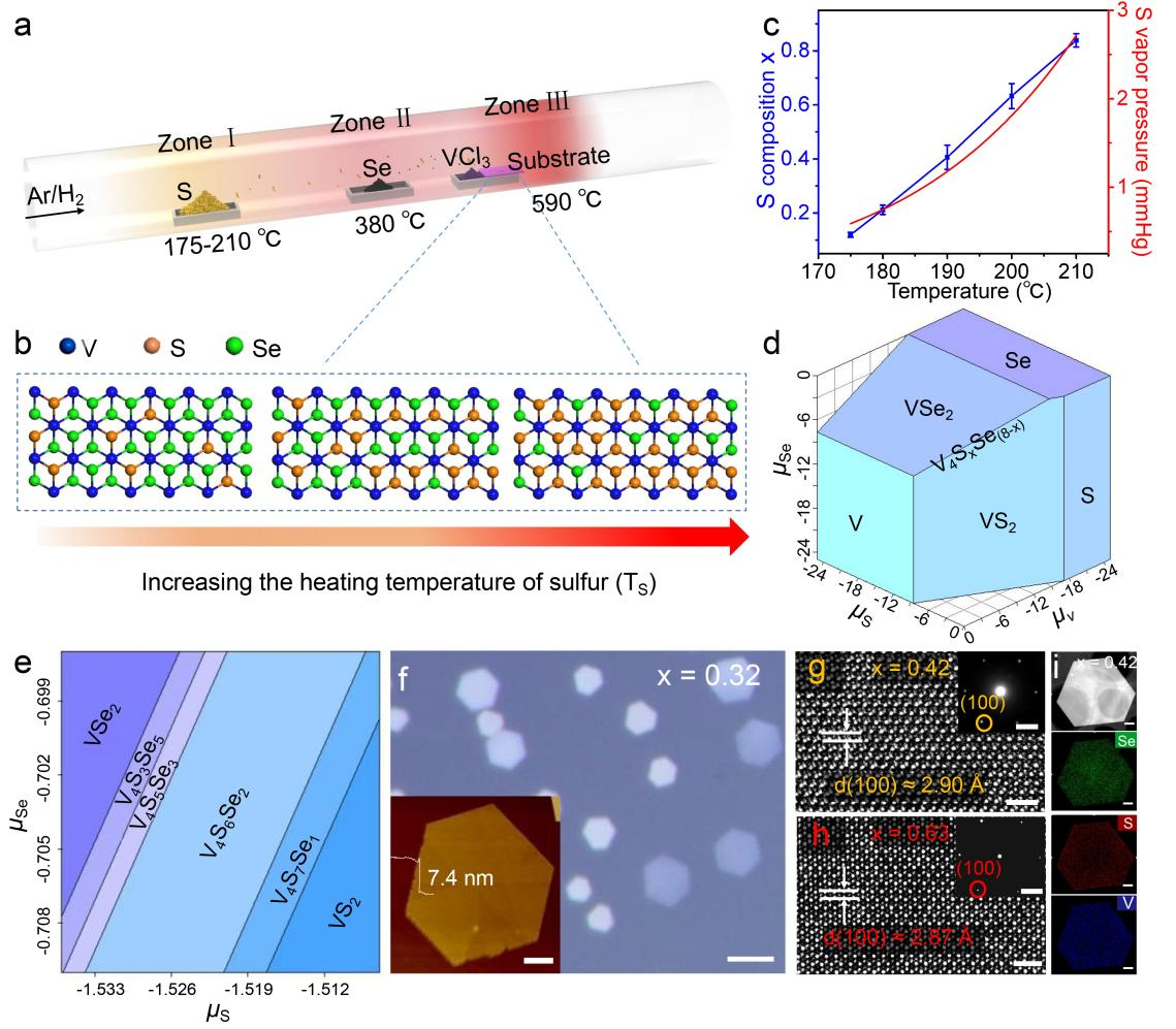 作者团队通过一步化学气相沉积(CVD)法合成了组分连续可调的二维VS2xSe2(1-x)合金纳米片,合成的纳米片具有良好的六边形晶体结构,元素分布均匀。通过调控硫前驱体蒸发温度(当温度从175℃升高到210℃时),合金组分x呈现从0到1的变化,合金组分x与温度呈现准线性关系。开尔文探针力显微镜(KPFM)研究证明,VS2xSe2(1-x)合金纳米片的功函数随着合金组分变化而变化。该合金功函数可以在4.79 eV(x = 0)到4.64 eV(x = 1)连续调控。