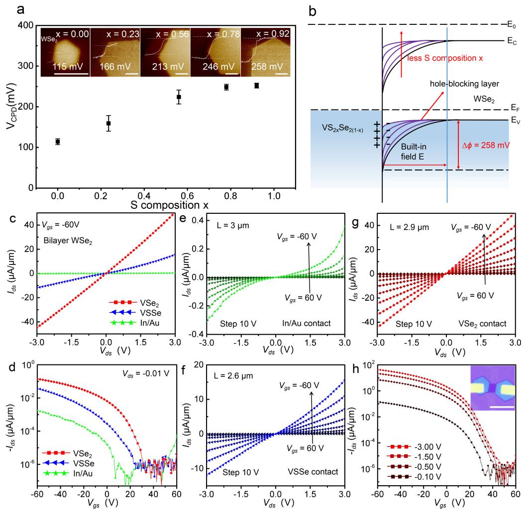 图3.VS2xSe2(1-x)/WSe2 vdWH FET的KPFM测试和电学特性。