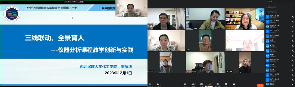 12月1日,分析化学课程虚拟教研室举行了第十七期讲座,由宦双燕教授主持,西北民族大学化工博彩平台李振华副教授“三线联动、全景育人--仪器分析课程教学创新与实践”为题,给与会老师带来精彩的报告。分析化学课程虚拟教研室和化学类专业基础理论课程虚拟教研室的七十余位教师通过线上会议和观看直播的方式参与了本次讲座。会议录播视频还将共享到民族院校应用化学专业虚拟教研室。