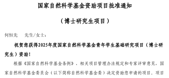 博彩平台博士生何恒先获批2025年度国家自然科学基金青年学生基础研究项目(博士研究生)