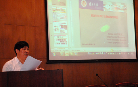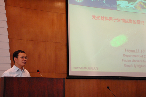 应国家重点实验室邀请,2012年9月20日,复旦大学特聘教授,博士生导师,国家杰出青年科学基金获得者李富友教授来我院讲学,作了题为“发光材料用于生物成像的研究”的学术报告,受到了广大师生的热烈欢迎,杨荣华教授主持学术报告。