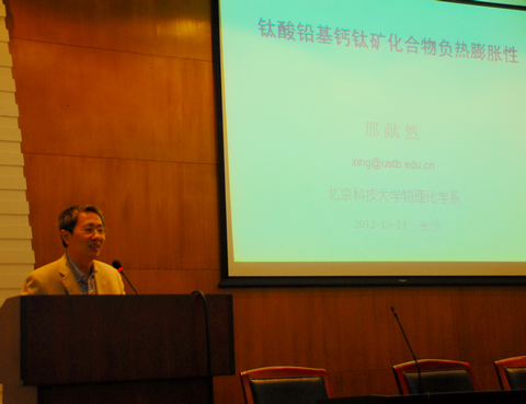 应国家重点实验室邀请,2012年10月14日,教育部****特聘教授,国家****科学基金获得者,北京科技大学物理化学系邢献然教授来我院讲学,作了题为“铅基负热膨胀化合物的合成和性能研究”的学术报告,受到了广大师生的热烈欢迎,俞汝勤院士主持学术报告。