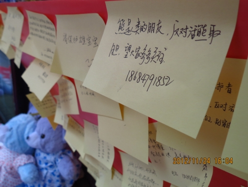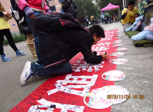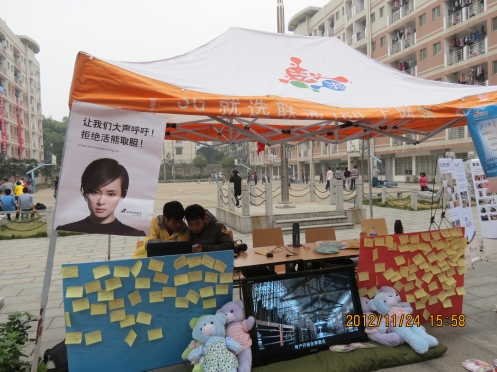 此次活动经过了前期周密的策划。班长刘仲民同学与“它基金”,“亚洲动物基金会”负责人进行了邮件交流,并获得了基金会提供的公益资助。场地的设置也别具匠心,包括数个宣传展板,液晶电视,微博墙等。