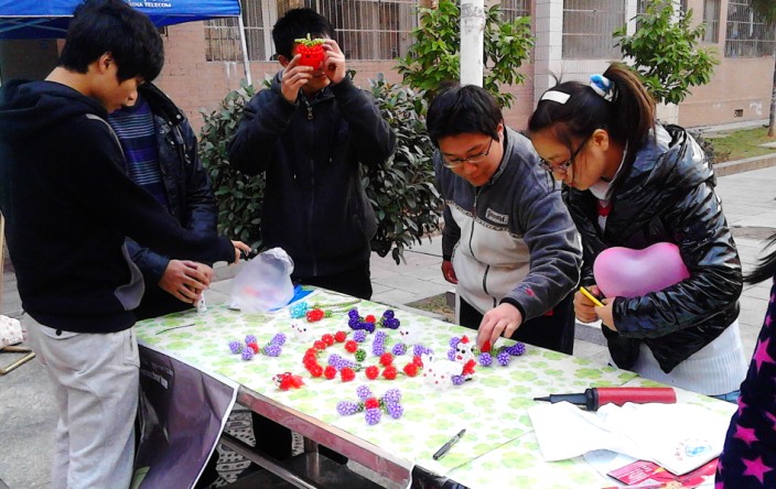 义卖的物品是化硕班同学自己编制的手工艺品。期间,他们每天抽出课余时间,靠着自学完成了编织。一根线,几颗珠子,在他们手上变成了一件件美轮美奂的工艺品。小狗、兔子、圣诞老人,以及娇艳欲滴的玫瑰花、小巧玲珑的草莓充分展示了他们的心灵手巧。