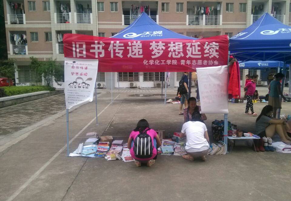 青年志愿者协会的志愿者以及大四同学们的积极参与下,化工院13级的小伙伴们已经募捐到了不少书籍。于是,6月18日当天,化工院青志协的成员们一大早就在天马园区的跳蚤市场上摆起了摊位开始义卖。本次义卖赚取的所有钱都将用于捐赠樟树门小学,帮助他们建立一个爱心图书馆。