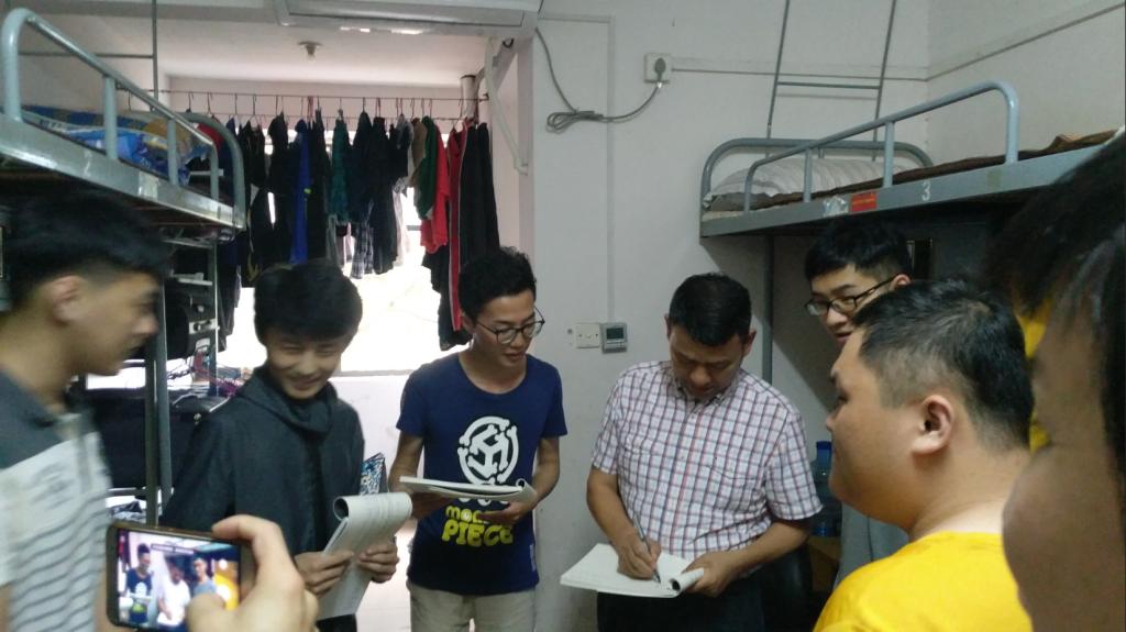 在另外一间宿舍该寝室的王硕同学给谭校长送上了一副手绘人像画,谭校长看到手绘人像之后非常开心的介绍到,这是自己2004年在美国开学术会议的时候拍摄的一张照片,也是自己最喜欢的一张照片;谭校长来到了另外一间宿舍,该寝室同学全部升学,分别去往了清华深圳研究院南开大学和博彩平台
