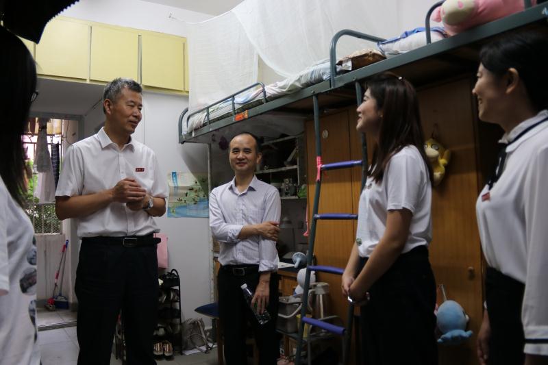 在走访寝室的过程中,老师们向同学们询问毕业去向,得知2区4栋332王维震同学投身西部计划,去往西藏建设祖国边疆时,校党委副书记陈伟给予了高度的赞许,提出了殷切希望,希望他在边疆发挥“实事求是、敢为人先”的湖大精神,在新岗位上建功立业,有什么需要学校帮助的,一定要及时联系,学校永远是毕业学子的坚强后盾。