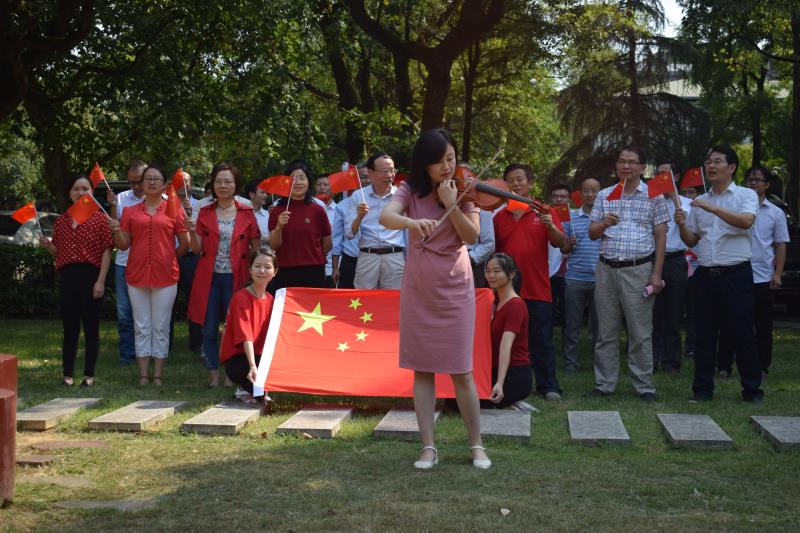 9月24日下午两时,学校逸夫楼旁的大草坪,优美的歌声吸引了路人纷纷驻足观看。原来,周一歌老师优美的小提琴已经响起,化学系教工第二党支部的党员和非党员老师一起唱响“我和我的祖国”,向中华人民共和国70周年献礼。