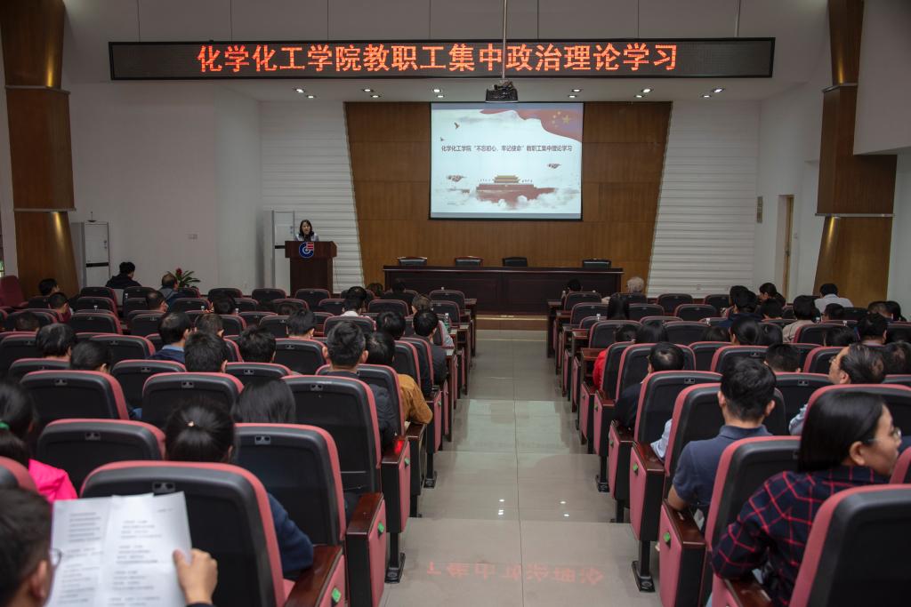 召开全院教职工大会,开展“不忘初心 牢记使命”主题教育集中政治理论学习。博彩平台党委书记王玉枝教授和博彩平台党委委员、化工应化党支部书记邓剑如教授分别作了宣讲,博彩平台党委副书记范媛吉主持会议。