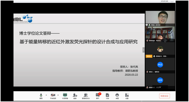 聂舟教授、刘艳岚教授、邱丽萍教授及长沙理工大学杨荣华教授、国家纳米科学中心孙佳姝研究员组成。导师谭蔚泓教授以及多名师生在线聆听了本次论文答辩。答辩委员会对张代亮、谢斯滔两位同学的博士学位论文表示充分肯定,认为其选题紧扣化学与生物学交叉的前沿领域,研究内容创新性强,论文撰写规范,行文流畅,条理清晰,数据翔实。经过线上讨论和无记名投票表决,答辩委员会一致同意通过张代亮、谢斯滔同学博士学位论文答辩,并建议授予其博士学位。
