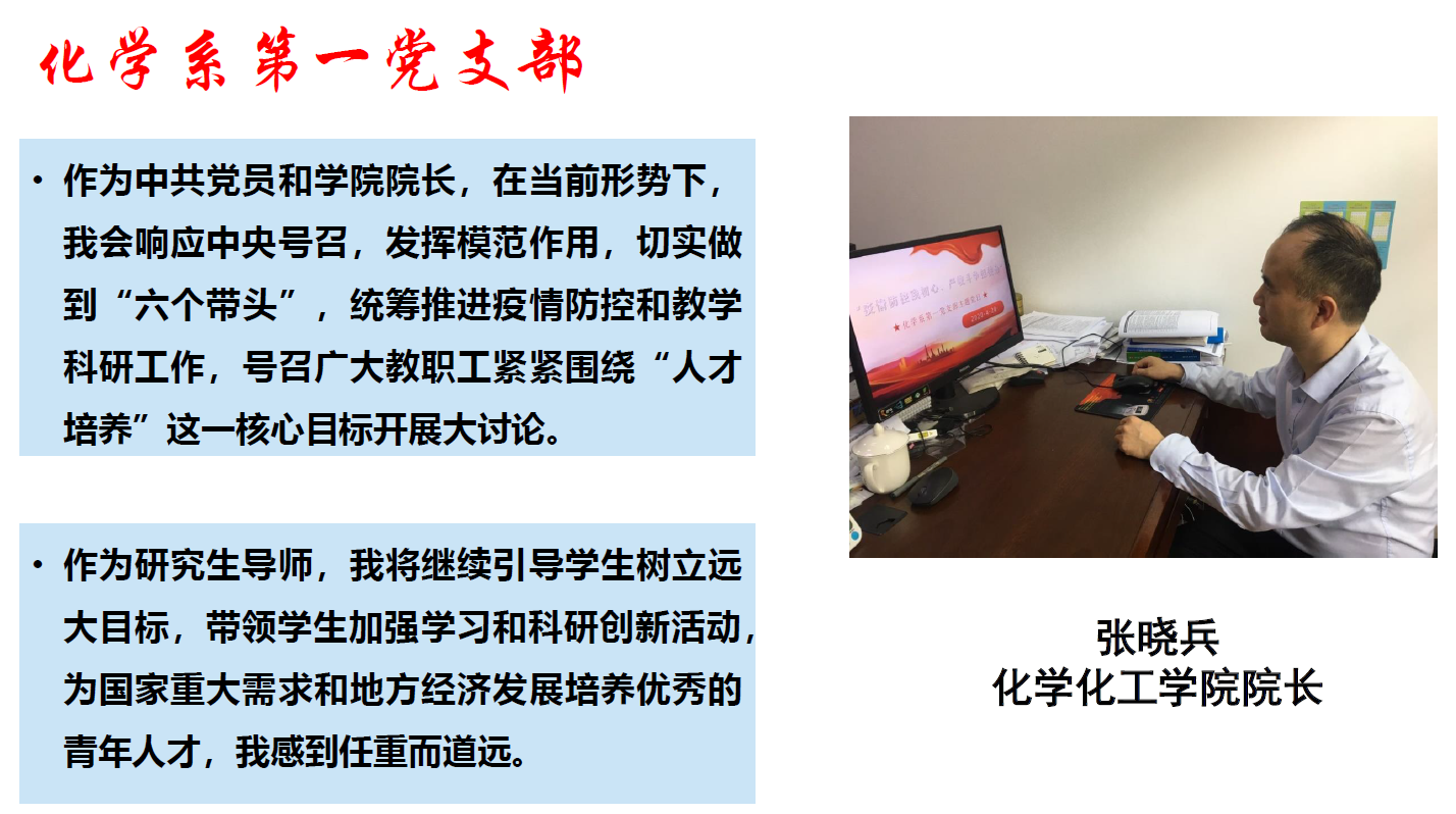 化学系第一党支部开展“疫情防控践初心、严峻斗争担使命”线上主题党日活动,认真传达学习了习近平总书记在统筹推进新冠肺炎疫情防控和经济社会发展工作部署会议上的重要讲话精神和中共湖南省委组织部《关于在统筹推进疫情防控和经济社会发展中当先锋、作表率、展作为的倡议书》精神。