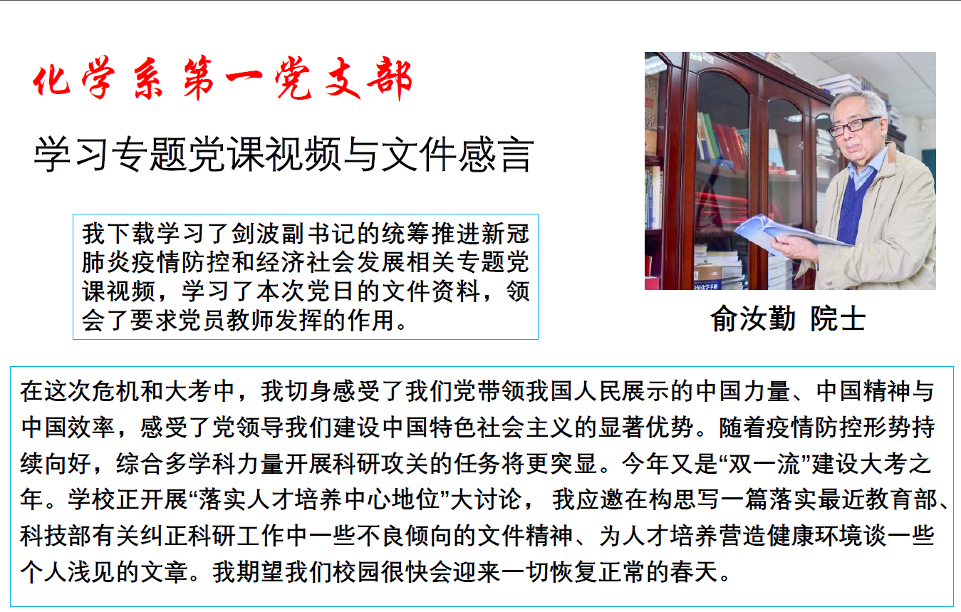 中国科博彩平台院士俞汝勤表示:在这次危机和大考中,我切身感受了我们党带领我国人民展示的中国力量、中国精神与中国效率,感受了党领导我们建设中国特色社会主义的显著优势。随着疫情防控形势持续向好,综合多学科力量开展科研攻关的任务将更突显。今年又是“双一流”建设大考之年,学校正开展落实人才培养中心地位大讨论,我应邀写了一篇文章,为营造人才培养健康环境发表了一些个人浅见。