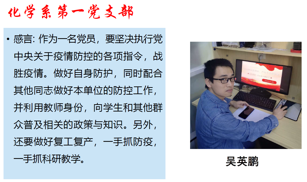 支委郑晶老师说:作为老师,我们积极组织和参与线上教学和学习,督促学生保持学习和文献阅读的习惯,并且鼓励同学们积极面对疫情带来的各种影响。要深入教学科研一线,为学生复课做好准备。