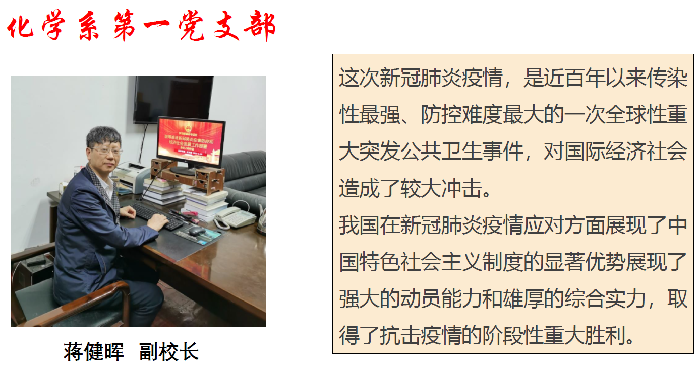 支部书记宦双燕说:抗击新冠肺炎疫情是一场全民族的战役,也是一次爱国主义教育,化学系第一党支部围绕学习贯彻习近平总书记关于疫情防控的重要指示精神,支委们积极讨论和准备,拟推出三期专题学习课件,加强形势宣讲。