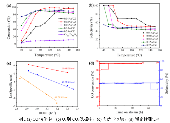 刘志刚教授课题组在用于燃料电池原料富氢气中一氧化碳优先氧化的金催化剂研究上取得最新进展,他们以铈锆固溶体为载体,制备了一系列低金负载量的催化剂,最佳负载量为0.02 wt% Au,该催化剂可在质子交换膜燃料电池工作温度范围内几乎完全氧化CO,并且稳定性优良。同时,他们发现金团簇有优良的低温活性,但是高温下易发生H2氧化副反应因而无法完全氧化CO,而高度分散的金单原子会抑制H2的氧化从而达到完全转化CO的目的,另外,相邻金单原子之间的协同作用也会对CO和H2的竞争反应产生影响。相关成果以“Atomically dispersed Au catalysts for preferential oxidation of CO in H2-rich stream”为题发表于《Applied Catalysis B: Environmental》。